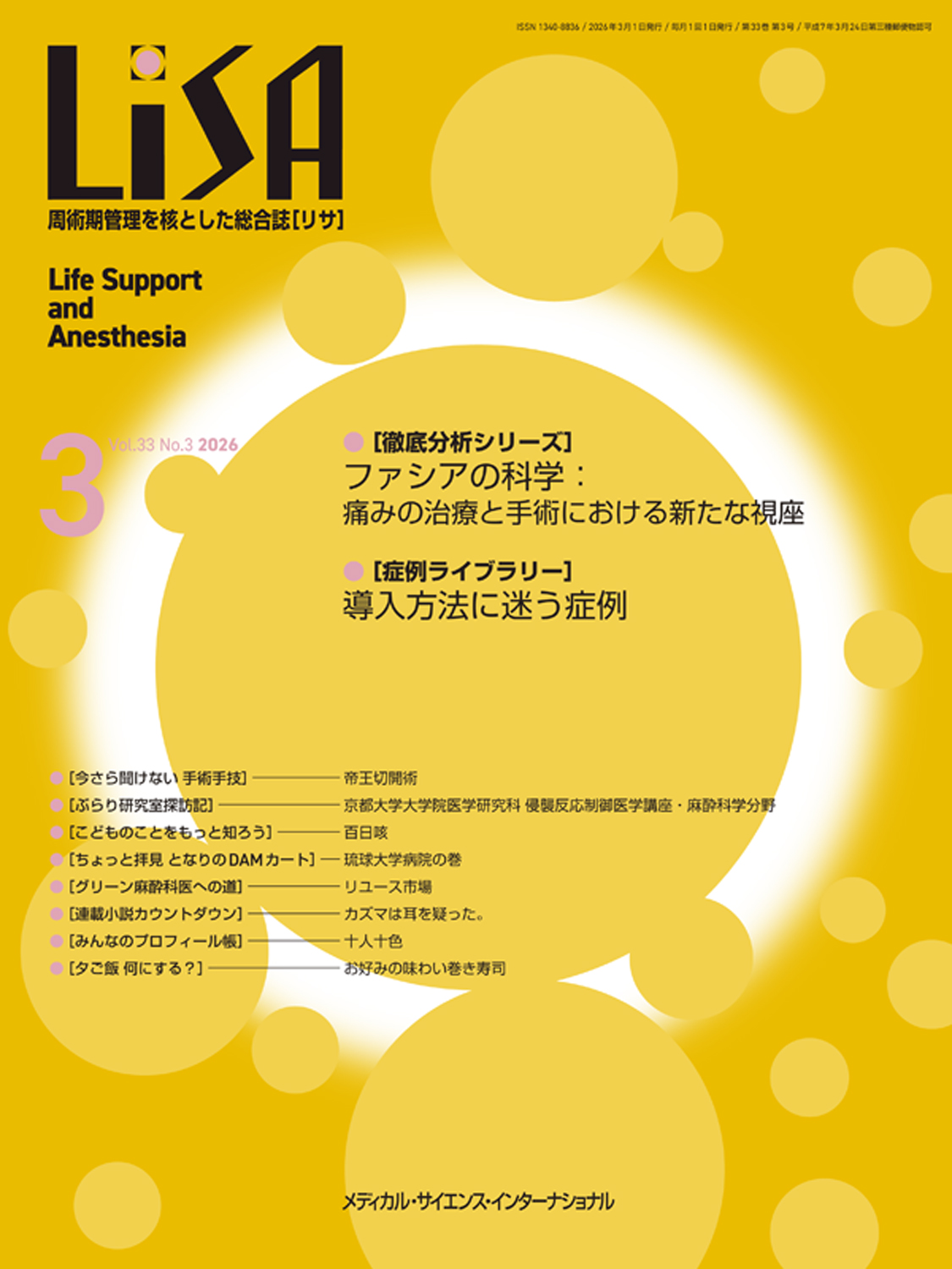 お知らせ 2026/02/18 雑誌「INTENSIVIST(インテンシヴィスト) 2026年1号(特集:“わかったつもり”で終わらせない血液凝固異常とDIC)発売しました! 2026/02/02 雑誌「LiSA 2026年2月号」発売しました。 2026/01/28 新刊「メディカル・ジェネラリズムNow! - ジェネラリストの軸、熟考 -」発売しました! 2026/01/28 新刊「医療者のためのバーンアウト防止戦略:Mayo Clinicに学ぶ12アクション」発売しました! 2026/01/06 雑誌「LiSA 2026年1月号」発売しました。 2025/12/17 新刊「集中治療×内科の診断戦略 - 重症患者診療の思考の軸のきたえ方 -」発売しました! 2025/12/15 2025年12月27日(土)〜2026年1月5日(月)は商品出荷を停止させていただきます。 ご不便をお掛けして申し訳ございませんが、何卒よろしくお願い申し上げます。 2025/12/01 雑誌「LiSA 2025年12月号」発売しました。 2025/11/21 雑誌「Hospitalist(ホスピタリスト)2024年4号(特集:ホスピタリストのための精神科の知識)」発売しました! 2025/11/19 ⽇本臨床⿇酔学会第45回大会限定 LiSAバックナンバープレゼントキャンペーンのご案内 一覧を表示する 雑誌年間購読 LiSA INTENSIVIST Hospitalist 読者のみなさまへ 正誤表 お問い合わせ 執筆者のみなさまへ 著作物の引用・転載について 投稿規定(LiSA) 出版企画のお問い合せ 広告掲載をお考えの方へ 媒体一覧 新刊案内 真菌症の診断と治療 LiSA 2026年3月号 - 周術期管理を核とした総合誌[リサ] - ICUブック 第5版 LiSA 2026年2月号 - 周術期管理を核とした総合誌[リサ] - メディカル・ジェネラリズムNow! INTENSIVIST(インテンシヴィスト) 2026年1号 LiSA 2026年1月号 - 周術期管理を核とした総合誌[リサ] - LiSA 2025年12月号 - 周術期管理を核とした総合誌[リサ] - 集中治療×内科の診断戦略 医療者のためのバーンアウト防止戦略:Mayo Clinicに学ぶ12アクション LiSA 2025年11月号 - 周術期管理を核とした総合誌[リサ] - Hospitalist(ホスピタリスト)2024年4号 INTENSIVIST(インテンシヴィスト) 2025年4号 INTENSIVIST(インテンシヴィスト)年間購読[2026年版] LiSA(リサ)年間購読[2026年版] LiSA 2025年10月号 - 周術期管理を核とした総合誌[リサ] - NYSORA© 困難静脈路確保マニュアル コメディカルのための画像医学アトラス 新刊一覧を表示する 雑誌最新号 INTENSIVIST(インテンシヴィスト) 2026年1号 LiSA 2025年12月号 - 周術期管理を核とした総合誌[リサ] - LiSA 2025年11月号 - 周術期管理を核とした総合誌[リサ] - Hospitalist(ホスピタリスト)2024年4号 INTENSIVIST(インテンシヴィスト) 2025年4号 雑誌一覧を表示する おすすめ医学書 シュロスバーグの臨床感染症学 第2版 ジェネラリストを目指す人のための 画像診断パワフルガイド 第2版 感染症プラチナマニュアル Ver.9 2025-2026 Grande 麻酔科臨床SUMノート 第2版 精神診療プラチナマニュアル Grande 第3版 循環器のトビラ カンデル神経科学 第2版 ギルバート発生生物学 第2版 トンプソン&トンプソン遺伝医学・ゲノム医学 第3版 医学的研究のデザイン 第5版 ラングマン人体発生学 第12版 カラーで学ぶ解剖生理学 第2版 ストール精神薬理学エセンシャルズ 第5版 総合内科病棟マニュアル 疾患ごとの管理(青本) 総合内科病棟マニュアル 病棟業務の基礎(赤本) 重症患者管理マニュアル エッセンシャル免疫学 第4版 臨床のための解剖学 第3版 臨床のための脳と神経の解剖学 MRIの基本パワーテキスト 第4版 ワシントンマニュアル 第14版 関節のMRI 第3版 スポーツリハビリテーションの臨床 不整脈治療薬ファイル 第2版 循環器治療薬ファイル 第3版 ハリソン内科学 第5版 胸部のCT 第4版 腹部のCT 第3版 カプラン臨床精神医学テキスト 第3版